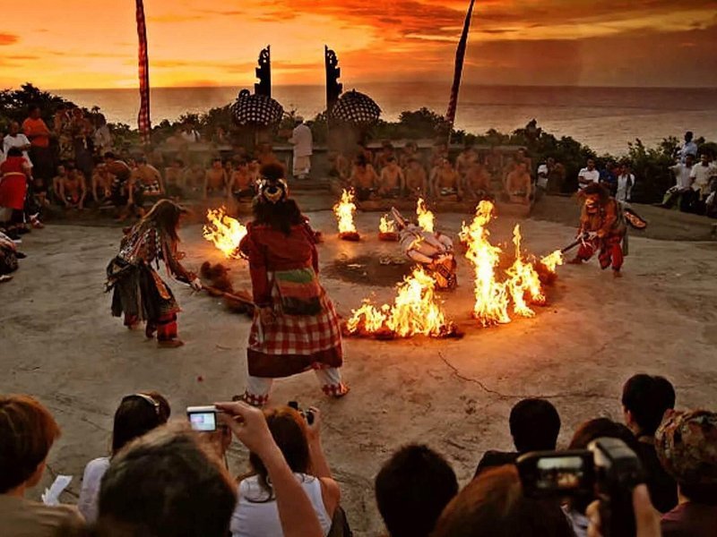 Traditional Balinese fire performance at sunset.