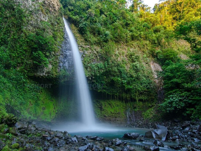 A jungle waterfall plunge into bright turquoise pools.