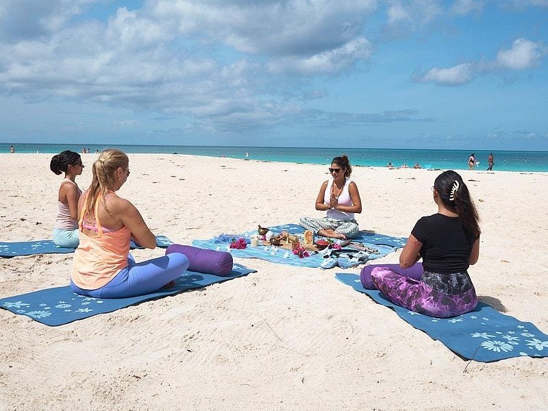 Morning yoga on the sand — pura vida relaxation.